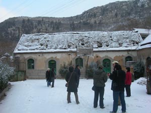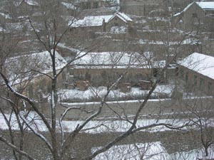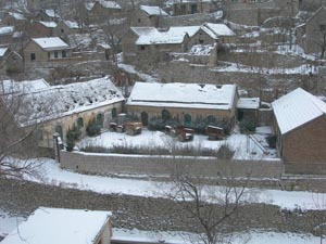 村里居然有一個文革時期留下的頗為現(xiàn)代的立交橋,依山傍勢,建造別致,載重的車輛、牛馬車可從橋下通過。自橋上逶迤走過去,便是那座已然廢棄的小學(xué)校,銹跡斑斑的圓拱鐵門,長方形的積雪的小院子,四五間教室,門框上還刻著“忠”字,一切都像回到過去的時光。小山村整體不大,幾十戶人家,但很有立體感,層次分明,像是江南的一個小村子不小心落在北方,房頂上覆滿雪,以及遠山的薄雪,一時又飄起雪來,寂靜無聲,讓我們這些從喧囂的鬧市中來的人頓有與世隔絕之感。