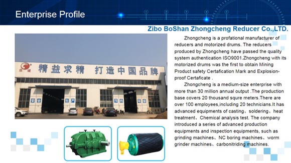 Zhongcheng is a profational manufacturer of reducers and motorized drums. The reducers produced by Zhongcheng have passed the quality system authentication ISO9001.Zhongcheng with its motorized drums was the first to obtain Mining Product safety Certafication Mark and Explosion-proof Certaficate .