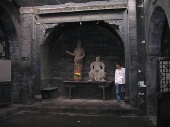 縣衙座落在平遙古城的中軸線上。俗話說(shuō)“衙門(mén)口朝南開(kāi),沒(méi)有錢(qián)莫進(jìn)來(lái)”,這座縣衙的衙門(mén)口照例也是朝南開(kāi)的??h衙是古城內(nèi)面積最大的一處建筑。正對(duì)門(mén)口是大堂,西邊角門(mén)是牢獄,東邊是縣太爺?shù)乃郊液蠡▓@和書(shū)房,看看多么講究,念個(gè)書(shū)還要七折八拐走那么遠(yuǎn)。還有專(zhuān)門(mén)一個(gè)小院落是縣太爺?shù)乃饺思Z倉(cāng)。最最后面是祠堂,供奉狐仙。供奉狐仙不是為了招桃花,而是保佑縣太爺升官。兩側(cè)是一排供奉土地神的側(cè)室。這里供奉的土地神可不是一位,而是一排八九位,各個(gè)雕像表情姿態(tài)各異,有的端坐,有的沉思,有的竟然是翹著二郎腿的老頭兒,還有的干脆歪倚著逍遙自在。為什么這么多土地神呢,因?yàn)檫@里的人們不嫌麻煩的把每一條街道都找了個(gè)土地神,真真可愛(ài)。