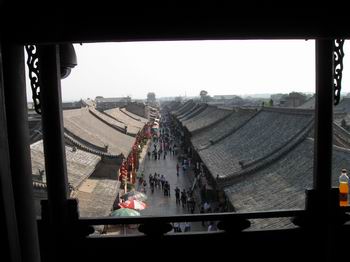 沿城門(mén)樓黑暗的拱形門(mén)洞下的石階拾級(jí)而上,穿出門(mén)洞黑暗的陰影,眼前豁然開(kāi)朗。城墻上面寬闊平坦,全非想象中的狹窄,青磚地面與城內(nèi)街道并無(wú)二致,據(jù)說(shuō)可并排跑兩輛馬車(chē)。關(guān)鍵問(wèn)題是這馬怎么才能從那么陡的城門(mén)樓石階下爬上來(lái),這個(gè)問(wèn)題實(shí)非想象力可解決。站在城墻上俯視全城,只見(jiàn)一片片青色屋脊層層疊疊,周?chē)察o異常,可惜沒(méi)有風(fēng),反而城墻上面毫無(wú)遮擋,一任大太陽(yáng)直射。想象一下古代的兵士在城墻上守衛(wèi)一方,夏天太陽(yáng)曝曬冬天北風(fēng)呼嘯,真是不容易!