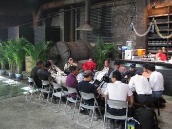 在柴油機(jī)廠展區(qū)的作品是比較知名的攝影家的作品,以風(fēng)景照居多,還有人物特寫(xiě)。柴油機(jī)廠展區(qū)的作品都是因地制宜擺放,一臺(tái)臺(tái)油乎乎的機(jī)床上面這兒擺一幅那里擺一幅,全非一般展覽那種正經(jīng)八百的布展方式。然而這種奇特的結(jié)合在這座古城竟然讓人感覺(jué)很正常,似乎天生就應(yīng)該是這樣子的。崎嶇不平的土路并不好走,那天天氣還非常炎熱,是我們?cè)谏轿鬟@五天內(nèi)最炎熱的一天。在柴油機(jī)場(chǎng)最里側(cè)有一家很著名的平遙酒吧。酒吧外是汾酒搭建的一個(gè)大棚做促銷(xiāo),小瓶裝竹葉青才五元一瓶,不愧是原產(chǎn)地,就是便宜,在外地都要賣(mài)到十四一瓶。酒吧內(nèi)沒(méi)有任何裝飾,就是利用柴油機(jī)廠的一間廠房改造而成,屋頂?shù)醯暮芨撸厦娴膲ι蟽扇烁叩牡胤绞且慌蓬?lèi)似百葉窗的木窗子,酒吧內(nèi)黑乎乎的,光線透過(guò)窗外斑駁的樹(shù)葉射進(jìn)室內(nèi),一縷縷陽(yáng)光就像紡紗的絲線,縷縷清晰可見(jiàn),真是說(shuō)不出的藝術(shù)感,吸引了很多人端著相機(jī)一陣狂拍。