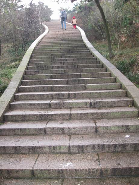 自山下逶迤而上,途經一片青翠竹林,雖時已是冬天,但茂林修竹,頗具一番清雅之氣。出了竹林,卻是小橋流水,工整別致,橋墩上綠銹斑駁,倒也顯出些歷史感來。越往上走,越是靜謐安然,旁邊樹上已全部沒了葉子,蒼蒼古拙,像是走進了歷史。驀地,一條蜿蜒曲折的石階象幅畫一樣擺在我們面前,延伸向上而去,遙無盡頭,旁書“云梯”,走過這么多地方,象這么貼切的景觀題字實在不多,這云梯不象別的石階,生硬冷漠成銳角形,而是圓潤光滑,拐角處處理得象是工筆畫里的女子云裳,如若無物,真是柔美至極。信步走去,也是仿若平地青云,石階非常平滑,意識不到是在登山,不覺已走完了云梯500多級石階。沿途繼續(xù)向上,旁邊居然長著很多蘆葦,“荒草萋萋鸚鵡洲”的感覺,心里很是詫異。