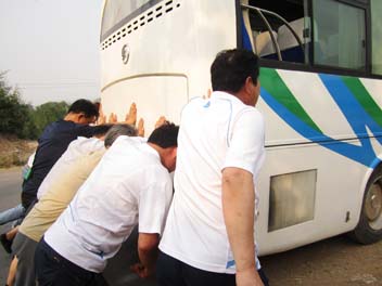 導(dǎo)游為了推薦大家購物,極力夸贊云臺(tái)山的玉有多么神奇,說她買了一個(gè)玉鐲,不帶時(shí)旅游就會(huì)碰到麻煩。不幸這次半路旅游車壞了,估計(jì)是導(dǎo)游又忘記帶玉鐲了,害得大家下去推車。
