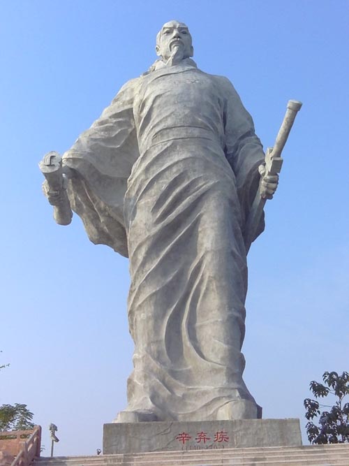 辛棄疾深度游則是出自先生,他是辛棄疾終級粉絲,這次出行本沒打算去鉛山,是準(zhǔn)備去三清山的,沒想到變成對他的生活足跡的追隨游。我們看了鉛山縣的辛棄疾巨型雕塑,足有32.5米高,建在一座小山上,面山背海,巍峨無比,辛棄疾雕像高大威猛,儒雅俊朗,左手持劍右手持書眼望北方,那是對一生為之付出的“醉里挑燈看劍,夢回吹角連營”對陣金國復(fù)國夢的一生寫照啊。我們又千辛萬苦的找到“稼軒鄉(xiāng)”,并打聽到墓地舊址,一路尋去。山中車行六七公里,最后一段須棄車步行上山,墓地冷冷清清,環(huán)境倒是群山環(huán)抱極為清YOU,據(jù)說他自己選取的墓地,我一陣難過,辛棄疾一生抗金,出生在濟南卻客死他鄉(xiāng)且終生不能返鄉(xiāng),因濟南是“敵占區(qū)”,抱負(fù)不能實現(xiàn),終日避居“瓢泉別墅”基本過著隱居生活終老于此。先生還不過癮,直呼要再來此地,遍訪當(dāng)年辛棄疾鉛山所寫詩詞發(fā)生地,踏遍鉛山尋訪。